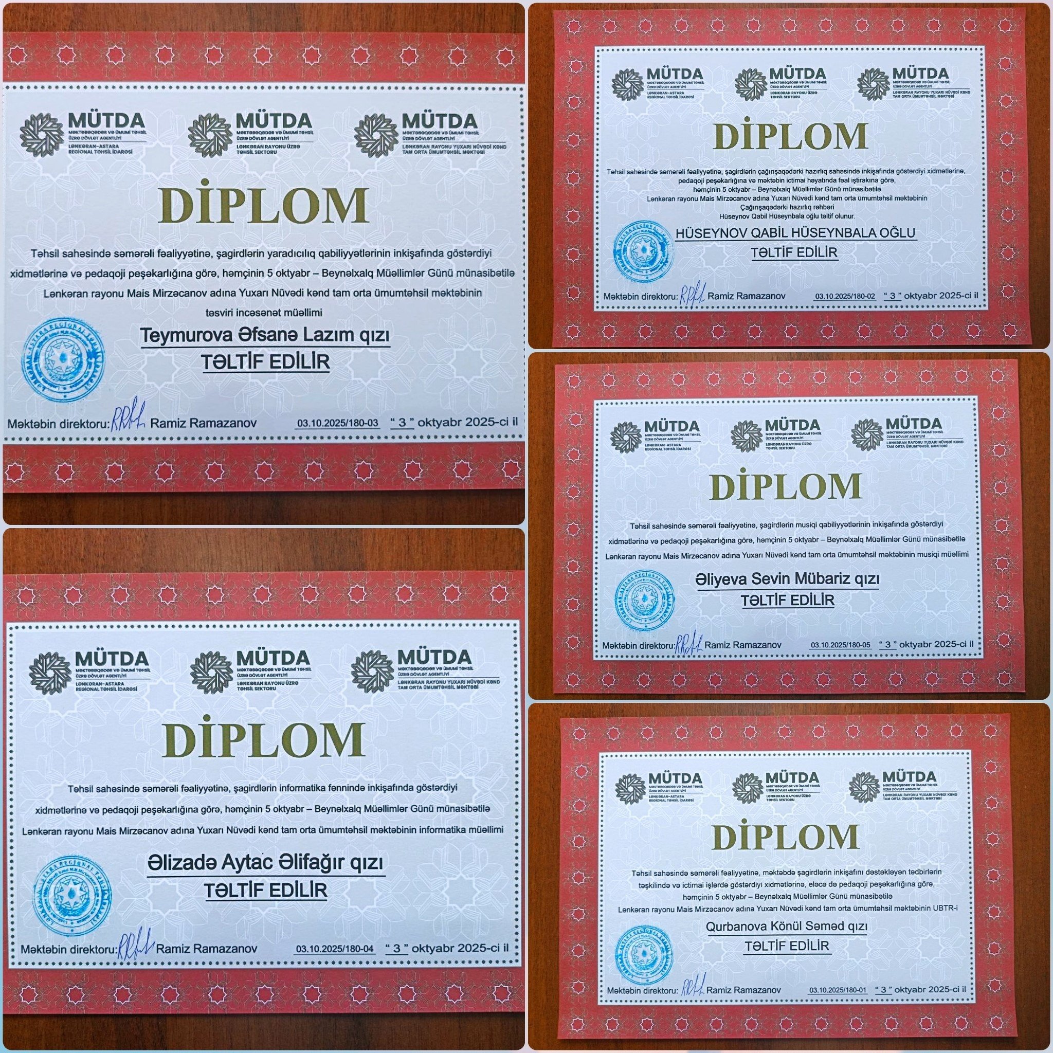 Sonda məktəb direktoru Ramiz Ramazanov bir daha kollektiv üzvlərini təbrik edərək onlara möhkəm can sağlığı, ailə səadəti və işlərində uğurlar arzulayıb. O, qeyd edib ki, təhsil sahəsinə göstərilən dövlət qayğısı hər bir müəllimi daha da ruhlandırır və yeni nailiyyətlərə səsləyir.